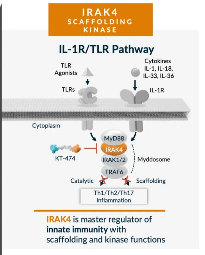 IRAK4是IRAK家族中的一员,全称是白细胞介素1(IL-1)相关激酶受体4,指的是能在 IL-1诱导下能和IL-1受体相结合的一类激酶,IL-1不必多说,典型的炎症因子,如图所示,在IRAK4通路继续向下传导,将会引起典型的过度免疫,导致炎症和自免疾病。