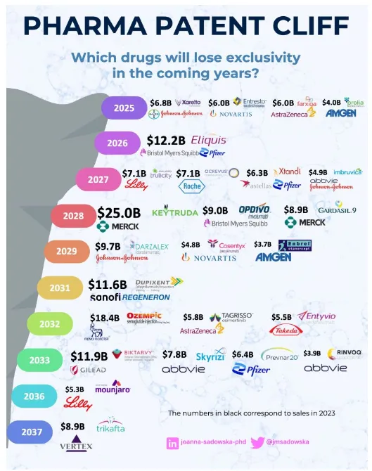近期,根据 Joanna Sadowska(PhD, EMBA)分享的“药品专利悬崖”,在未来十几年中,有近200种药物(包括年销售额超过10亿美元的69种重磅药物)将失去其知识产权保护。