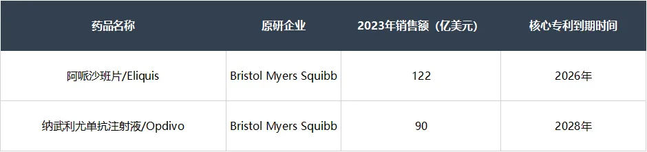 BMS在2026年、2028年将分别面临阿哌沙班片(Eliquis)和纳武利尤单抗注射液(Opdivo)的专利悬崖,这两款产品销售额占2023年BMS总营收的47%。