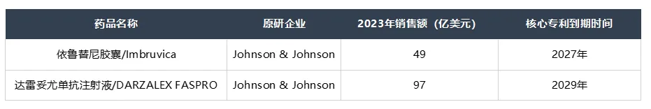 强生2027年、2029年将分别面临依鲁替尼胶囊(Imbruvica)和达雷妥尤单抗注射液(DARZALEX FASPRO)的专利悬崖,这两款产品销售额占2023年强生制药业务总营收的26%。