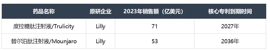 礼来2027年、2036年将分别面临度拉糖肽注射液(Trulicity)和替尔泊肽注射液(Mounjaro)的专利悬崖,这两款产品销售额占2023年礼来总营收的36%。