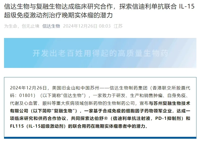 信迪利单抗的第八项适应症才刚获批,12月26日一早信达生物便马不停蹄般地在官微宣布了一项关于该PD-1抑制剂的最新合作——就信迪利单抗与复融生物的IL-15超级激动剂达成了联合用药用于治疗晚期实体瘤的临床研究及供药合作协议。