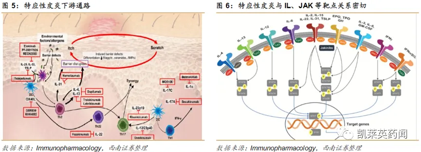 研究发现,特应性皮炎与IL-4、IL-13、JAK等通路关系密切。IL-4和IL-13在特应性皮炎发病中,起核心作用。IL-4和IL-13结合后,通过JAK1,诱导转录因子STAT6磷酸化,发挥作用。