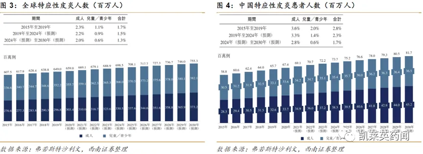 全球特应性皮炎患者人数于2022年达6.8亿人,其中儿童/青少年达3.6亿人。预计到2030年达7.5亿人,其中儿童/青少年达3.8亿例。我国特应性皮炎患者人数于2022年达7070万例,其中儿童/青少年达3470万例。预计到2030年达8170万人,其中儿童/青少年达3650万例。