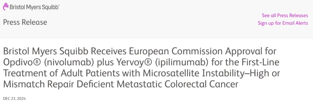 随着这一批准,Opdivo®联合Yervoy®成为欧盟首个批准用于MSI-H/dMMR mCRC一线治疗的双检查点抑制剂治疗药物。