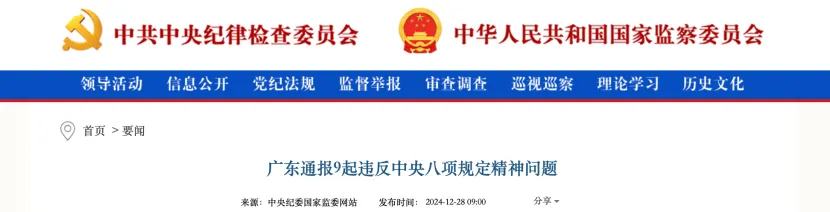 12月28日,中纪委官网发布《广东通报9起违反中央八项规定精神问题》。