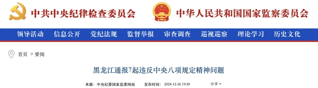 此前,中纪委官网还发布了《黑龙江通报7起违反中央八项规定精神问题》,其中提到,依安县人民医院党总支原书记张金涛违规收受礼品、违规大操大办等问题。
