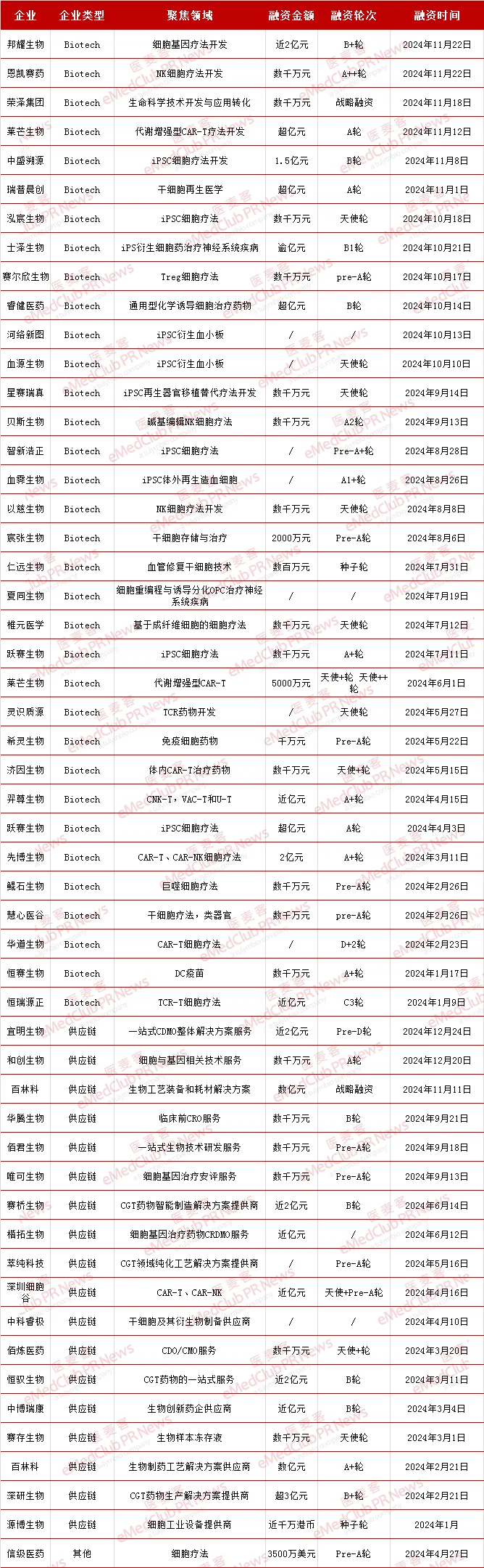 ▲ 2024年细胞治疗领域融资进展(个人整理,如有疏漏错误,欢迎补充指正)
