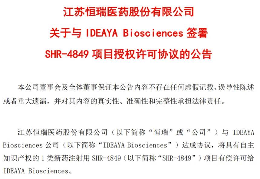 2024年12月29日,恒瑞医药发布公告,将DLL3 ADC新药SHR-4849大中华区外全球权益授权给IDEAYA Biosciences。