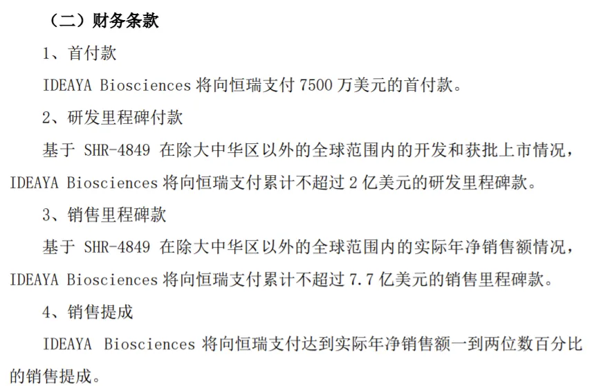 Biosciences向恒瑞医药支付7500万美元预付款,2亿美元研发里程碑,7.7亿美元销售里程碑,以及一到两位数百分比的销售分成,协议总金额高达10.45亿美元。