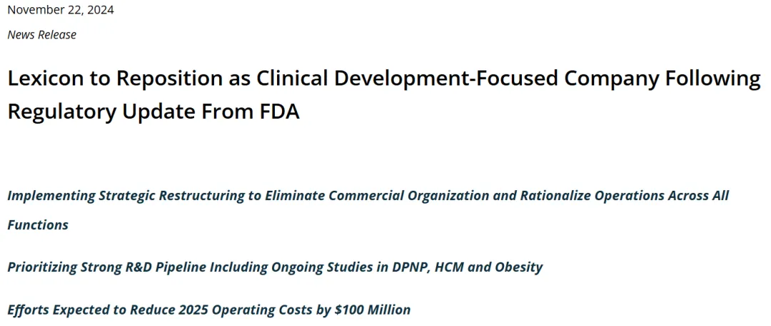 2024年11月22日,美国生物制药公司Lexicon Pharmaceuticals宣布做出战略决策,取消其商业运营,合理化所有职能的资源,以保留现金,将资源集中在推进其临床开发管线上。这一决策使该公司裁员约60%。