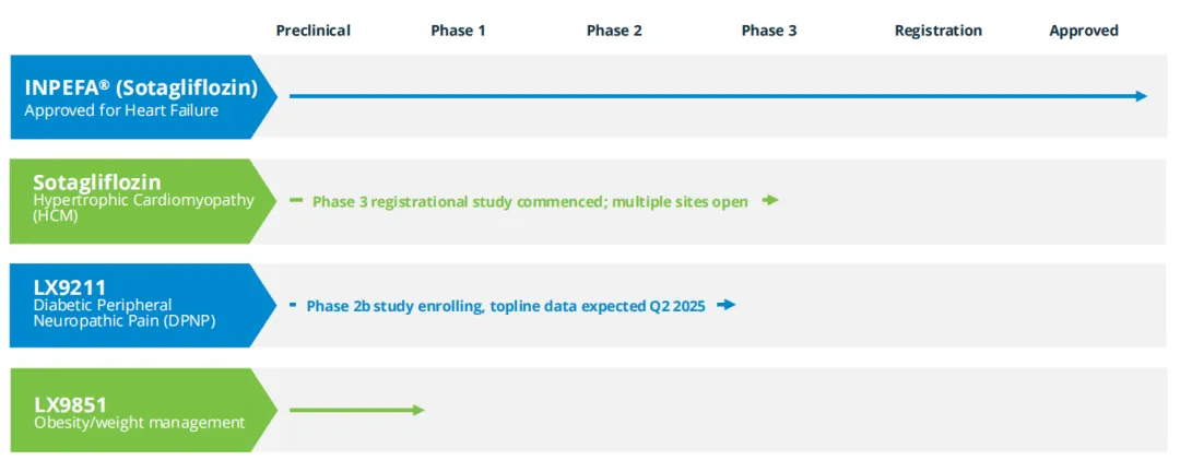 另外,Lexicon在2024年10月与晖致(Viatris)达成合作,将索格列净在美国和欧洲以外地区所有适应症的独家商业化权利授予晖致,Lexicon则保留在美国和欧洲的权利。根据该协议,Lexicon获得2500万美元预付款,为推进管线项目提供了非稀释性资本,并有资格获得近2亿美元里程碑付款,以及分级版税。