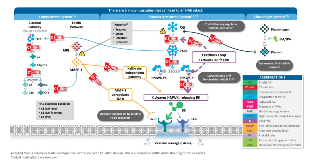HAE是以发作性、自限性、局限性皮肤和黏膜非凹陷性水肿为特征的原发性补体缺陷病,最常见的病因是一种名为人C1抑制剂(C1INH)的血浆蛋白功能缺乏,患者缺乏C1INH会导致补体级联反应失控,造成某些介质过度分泌,导致液体从血管渗漏到组织间隙。HAE发作时最常见的症状是激肽释放酶(kallikrein)分泌过多,从而导致液体过度渗漏到组织间隙(水肿或肿胀),患者可能会出现阵发性剧烈腹痛、恶心和呕吐,并因肠壁肿胀而加剧。气道或喉部肿胀尤其危险,可导致窒息死亡。如不及时治疗,发作可持续数天。