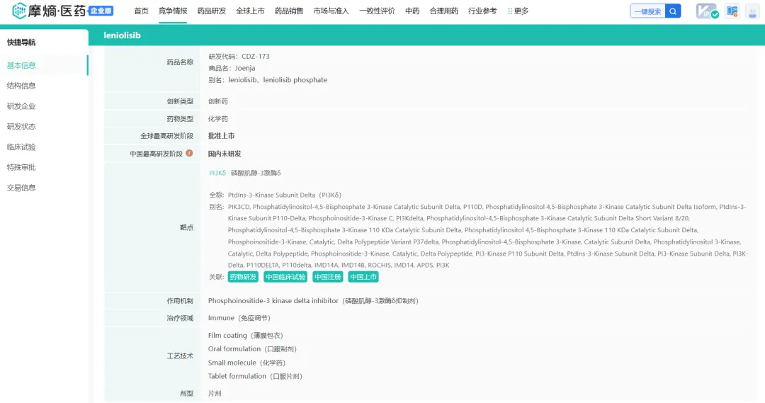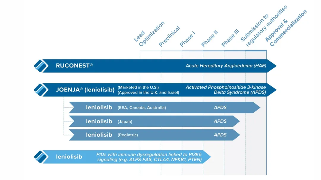 公司的第二个商业化产品Joenja(leniolisib)是首个也是唯一获批的活化磷脂酰肌醇3-激酶δ(PI3Kδ)综合征 (APDS)疾病调整疗法,这是一种小分子PI3Kδ抑制剂,2019年获得诺华公司的许可,2023年3月获得美国FDA批准,用于治疗12岁及以上成人和儿童APDS患者;2024年9月26日,英国MHRA授予了Joenja(leniolisib)的上市许可,也是用于治疗12岁及以上成人和儿童APDS患者。