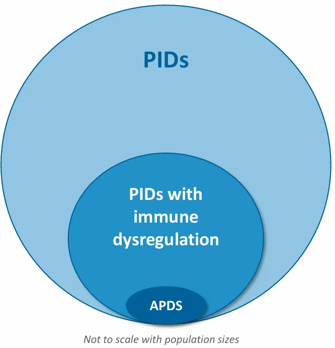 APDS是一种进行性原发性免疫缺陷和调节障碍疾病,其特征是严重、反复的鼻窦肺部感染;持续、严重或反复的疱疹病毒感染,尤其是Epstein-Barr病毒(EBV)和巨细胞病毒(CMV);淋巴结病、肝肿大、脾肿大和/或结节性淋巴增生;自身免疫性细胞减少症;肠病;支气管扩张;恶性肿瘤,尤其是淋巴瘤;以及B和T细胞功能失调。