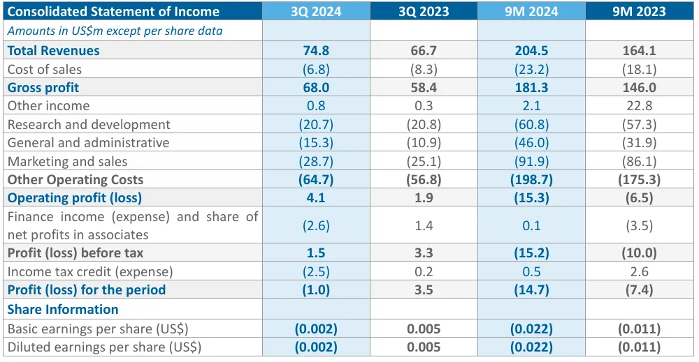 2024年前三季度Pharming的总收入为2.045亿美元,与上年同期相比增长25%,RUCONEST的总收入为1.726亿美元,Joenja的收入为3190万美元,以上增长主要是由交易量的增加推动的;其他收入从上年同期的2280万美元降至200万美元;毛利为1.813亿美元,与上年同期相比增加24%;2024年前九个月的运营费用增加是由于对Joenja的持续投资、在美国境外推出leniolisib的准备工作、增加研发投资以扩大leniolisib特许经营权以及由于业务增长而增加的工资支出,运营亏损为1530万美元;净亏损为1470万美元。