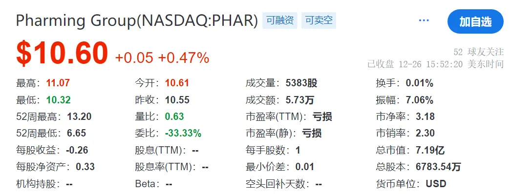 2024年9月30日,Pharming的现金和现金等价物为1.733亿美元,因为公司今年回购了1.349亿美元的未偿可转换债券和1390万美元的税款,被新发行的可转换债券的1.045亿美元净收益所抵消。对于快要结束的2024年,Pharming预计总收入在2.8~2.95亿美元之间。截止2024年12月26日,公司总市值为7.19亿美元,约合人民币52.5亿元。发稿前市值为6.58亿美元。