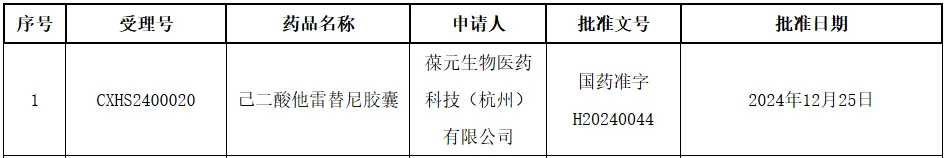 1 月 2 日,NMPA 官网显示,葆元医药(已被 Nuvation Bio 收购)申报的 1 类创新药 ROS1 抑制剂「己二酸他雷替尼胶囊」新适应症获批上市,用于一线治疗未经 ROS1-TKI 治疗的 ROS1 阳性局部晚期或转移性非小细胞肺癌(NSCLC)的成人患者。该适应症于 2024 年 3 月获 NMPA 受理并授予优先审评资格。