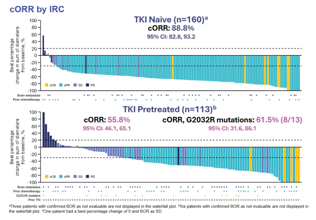 2024 ESMO 大会中公布的最新结果显示,在未经 TKI 治疗的患者中(n=160),cORR 为 88.8%(95%CI: 82.8, 93.2)。中位随访 21.2 个月(范围:3.6 - 46.6),中位 DOR 和中位 PFS 分别为 44.2 个月(95%CI: 30.4, NR)和 45.6 个月(95%CI: 29.0, NR) 。