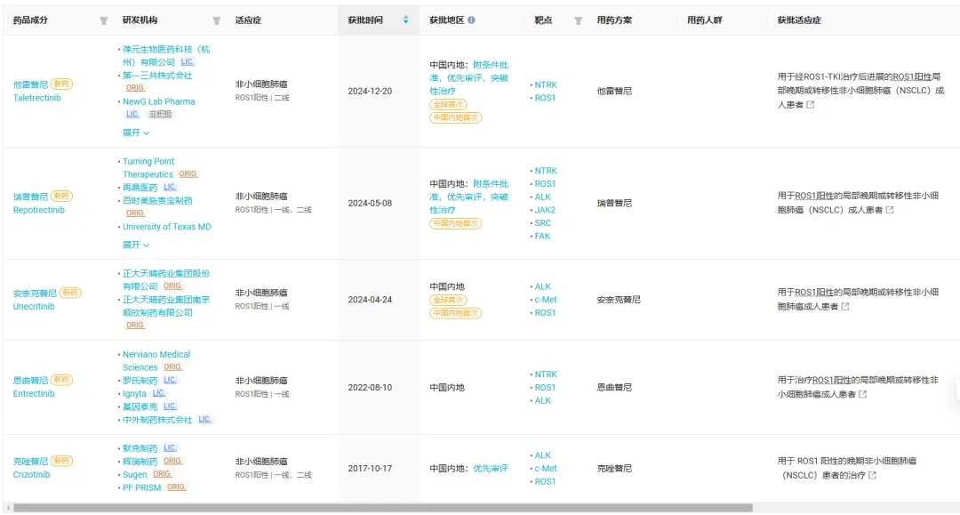他雷替尼(Talectrectinib)是一种口服、强效、脑渗透、选择性、新一代 ROS1 抑制剂。该药早于 2022 年就被 CDE 纳入突破性治疗。在海外,美国 FDA 也授予其突破性疗法资格认定。2024 年12 月,该药首次获批上市,用于经 ROS1-TKI 治疗后进展的 ROS1 阳性局部晚期或转移性 NSCLC 成人患者。
