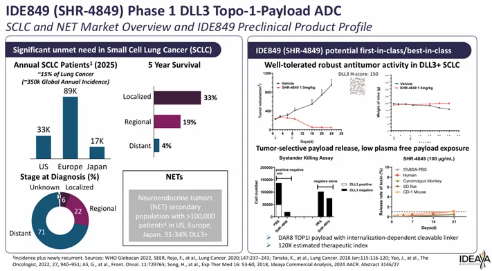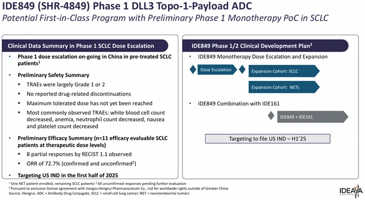 要在SCLC这个恶性程度高、进展快的癌种上取得如此显著的疗效并不容易。Rova-T最初备受瞩目的I期ORR数据也不过44%,且这一数据还是针对DLL3高表达的患者。引进方IDEAYA认为,SHR-4849具有first-in-class或best-in-class的潜力。