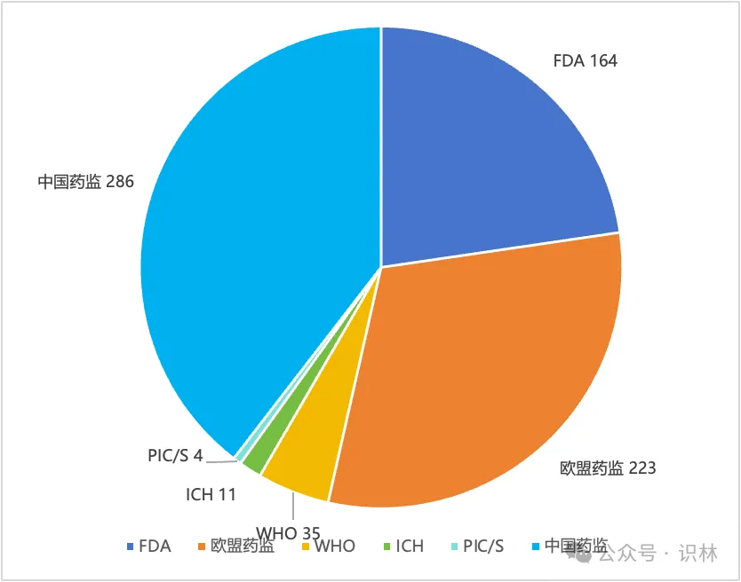 2024年,识林更新了全球主要监管机构的数千份官方文件。剔除各类公告通知、个药标准或BE、年度报告等内容,仅保留与企业日常工作最相关的法规指南内容, 6大主要监管机构发布了723篇法规指南类文件。其中,中国286篇(包含非药监部门发布的重要文件),欧盟药监223篇,美国FDA 164篇,ICH 11篇,PIC/S 4篇,以及WHO 35篇。