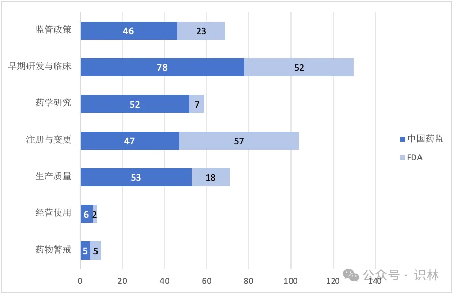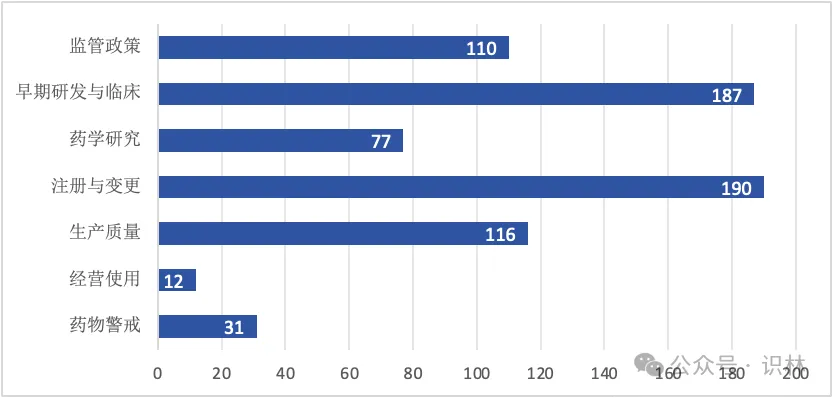 从分类数量来看,一如既往,临床和注册领先,经营和药物警戒较少,药学研究与生产质量居中。