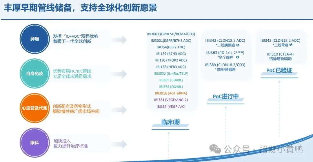公司已布局10多个双抗项目,包括IBI363(PD-1/IL-2双抗)、IBI343(CLDN18.2 ADC)、BI389(CLDN18.2/CD3双抗)、IBI133(HER3 ADC)、IBI3003(GPRC5D/BCMA/CD3)等。IBI363作为全球PD-1/IL-2靶点研发进度最快的药物之一,其临床数据表现出色,具备出海潜力。IBI389在1期临床研究中,针对胃癌及胰腺癌展现出初步疗效。此外,信达生物还布局了IL-4R/TSLP双抗IBI3002,标志着公司在自免领域的双抗布局。