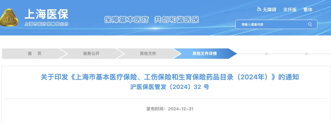 2024年12月31日,上海医保局发布《上海市基本医疗保险、工伤保险和生育保险药品目录(2024年)》的通知。