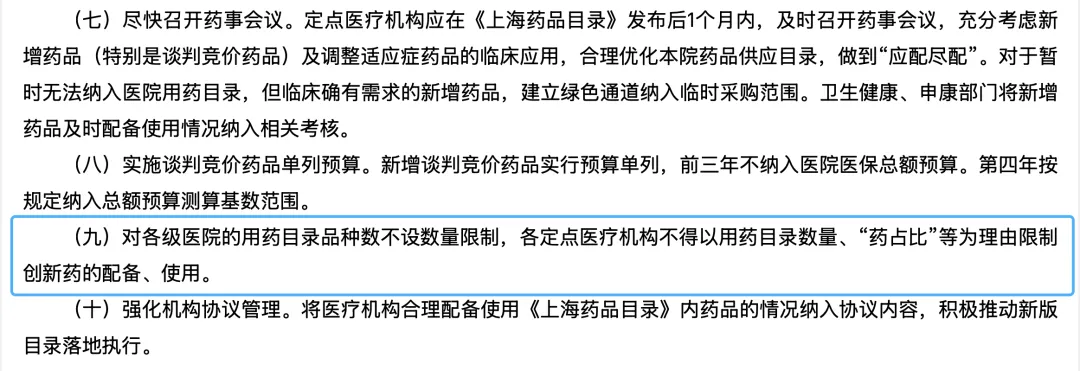 上海在这份通知中明确提出,对各级医院的用药目录品种数不设数量限制,各定点医疗机构不得以用药目录数量、“药占比”等为理由限制创新药的配备、使用。