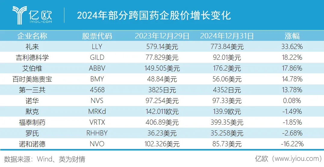 值此2024年二级市场年终收盘之际,亿欧梳理了自2023年度最后一个交易日(2023年12月29日)至今(截至2024年12月31日12点)这一整年间跨国药企的股价走势,并结合生物医药行业媒体网站BioSpace公开信息,筛选并汇总出波动较为明显的十家企业,以供业界参考。