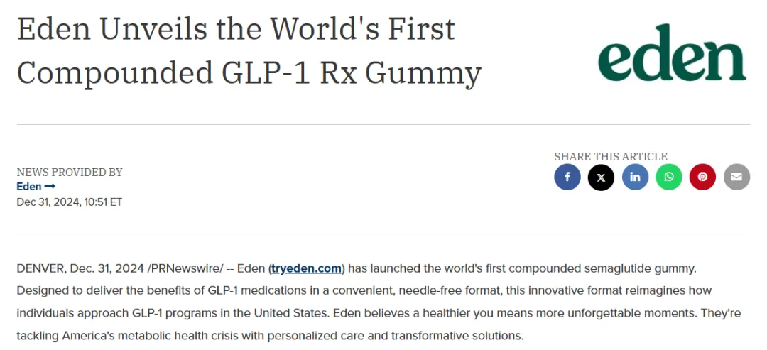 2024年12月31日,Eden宣布上市司美格鲁肽咀嚼软糖,这是全球第一款司美格鲁肽咀嚼软糖。Eden旨在以无需针头注射的便捷形式提供司美格鲁肽等GLP-1药物的益处,并推动实现患者的个性化用药。