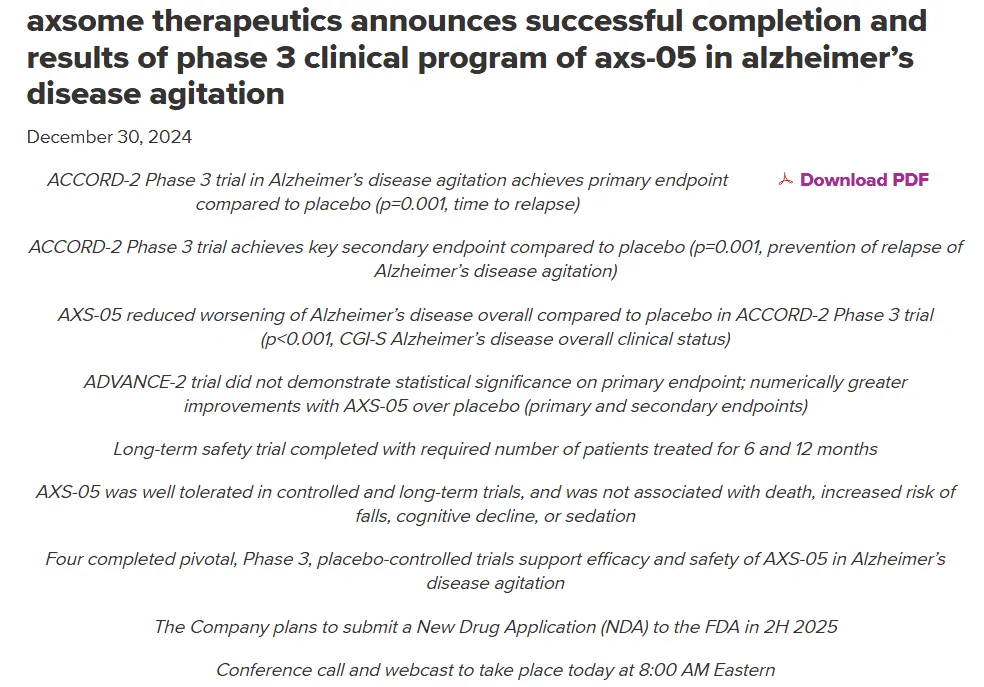 Axsome 计划根据上述研究的疗效和安全性数据,在 2025 年下半年向 FDA 提交 AXS-05 治疗 AD 躁动症的新药上市申请。此前,AXS-05 已被授予治疗阿尔茨海默病躁动症的突破性疗法认定。
