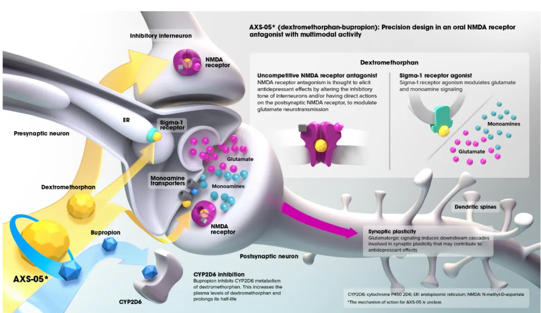 AXS-05 采用右美沙芬和安非他酮的专有配方、剂量,以及 Axsome 代谢抑制技术来调节成分的输送,被开发用于治疗阿尔茨海默病躁动和戒烟。右美沙芬是一种口服 NMDA 受体拮抗剂、sigma-1 受体激动剂,安非他酮是一种去甲肾上腺素和多巴胺再摄取抑制剂,可提高右美沙芬的生物利用度。