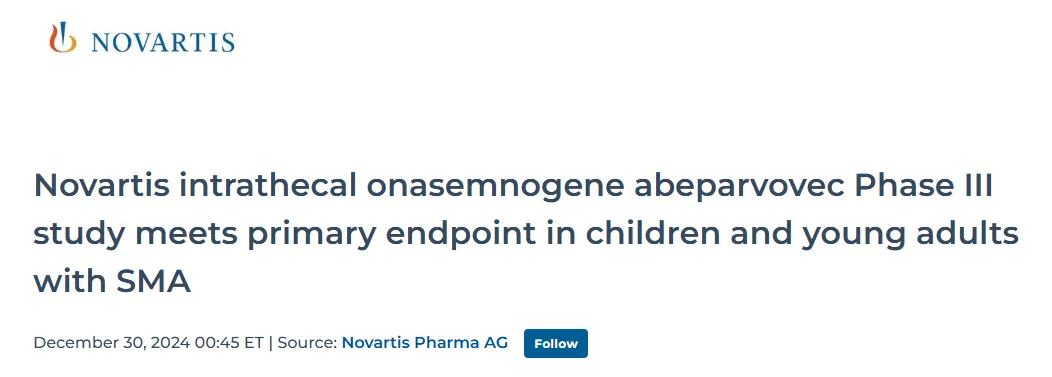 截图来源:企业官网研究结果显示,相较于对照组,接受鞘内注射 Onasemnogene abeparvovec 治疗的 SMA 患者的 Hammersmith 运动功能量表扩展版(HFMSE)总分较基线有所增加,这表明 SMA 患者的运动功能得到改善。详细数据将在 2025 年即将举行的医学会议上公布。