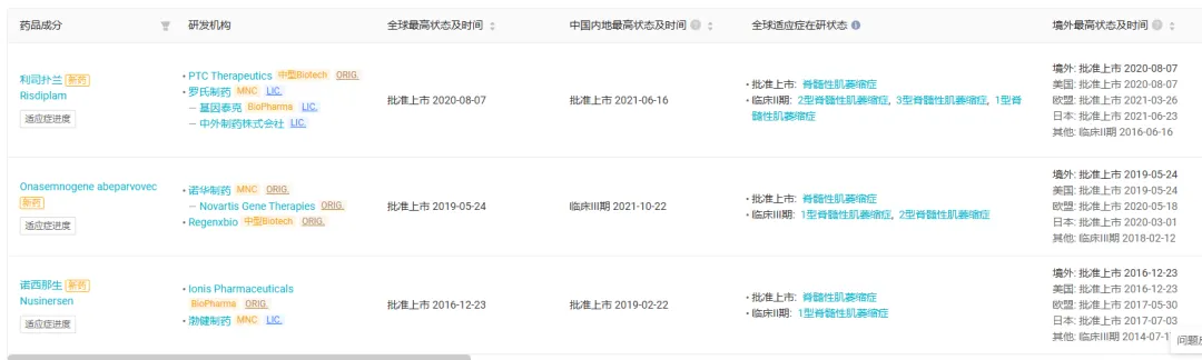 Insight 数据库显示,目前全球范围范围内,SMA 新药仅获批 3 款,分别是 PTC Therapeutics 的利司扑兰、Ionis Pharmaceuticals 的诺西那生和诺华的 Onasemnogene abeparvovec。值得一提的是,其余 2 款均为化药,仅诺华 1 款为基因治疗药物。