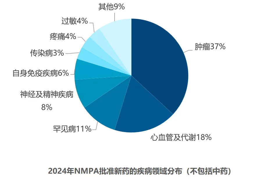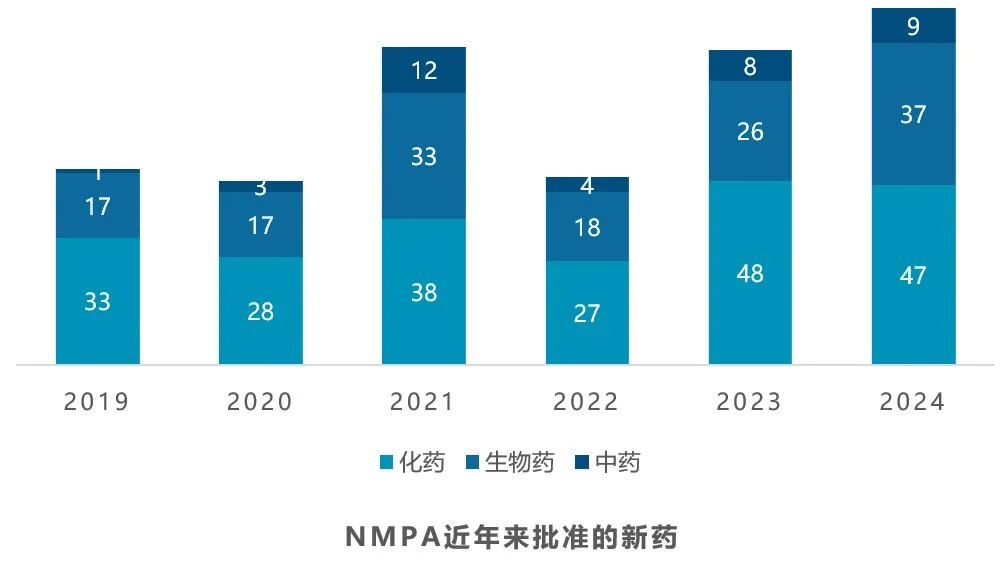 2024年,国家药品监督管理局(NMPA)累计批准了93款新药,包括47款化药(小分子、多肽及核酸)、37款生物药(单抗、双抗、ADC、细胞疗法等)、9款中药。与往年相比,2024年NMPA批准新药数量显著上涨,为近五年来最高值。