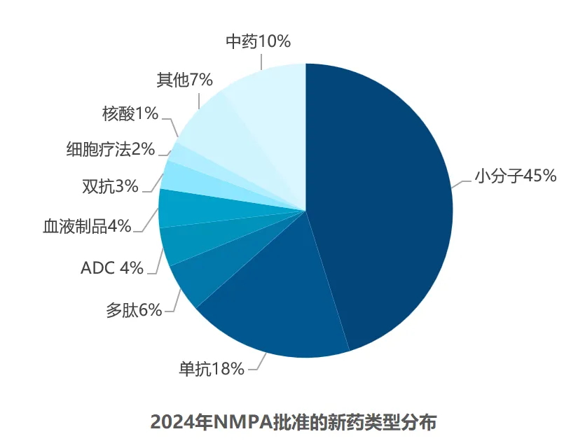 在药物类型的分布上,小分子药物在2024年获批的新药中占据主导地位,占比达45%(42款)。之后依次为单抗、多肽、ADC、血液制品、双抗、细胞疗法、核酸等。另外,中药的占比也达到了10%。