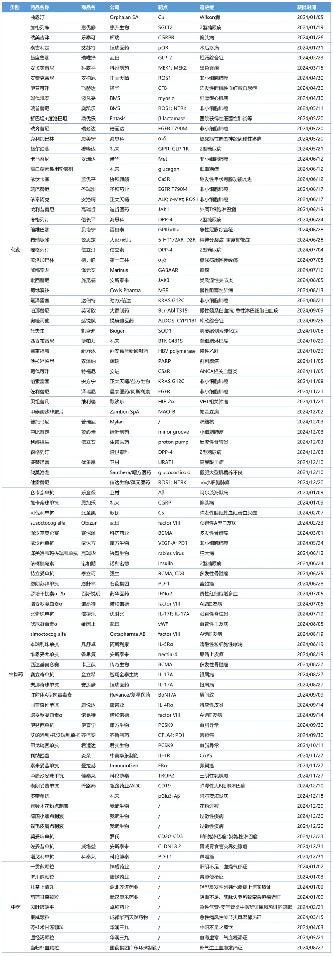 另一方面,2024年NMPA共批准了50款进口药物,涉及的治疗领域广泛且创新药物类型丰富,填补了更多的患者需求。其中不乏first-in-class的药物,包括安斯泰来的维恩妥尤单抗、吡西替尼和佐妥昔单抗、礼来的替尔泊肽、阿斯利康的本瑞利珠单抗、武田的替度鲁肽、Recordati的奥唑司他、瓴路药业/ADC Therapeutics的泰朗妥昔单抗、默沙东的贝组替凡、优时比的比奇珠单抗、安进的阿伐可泮、BMS的玛伐凯泰、罗氏的莫妥珠单抗、强生的特立妥单抗、华东医药/ImmunoGen的索米妥昔单抗、礼来/信达的匹妥布替尼、渤健的托夫生等。
