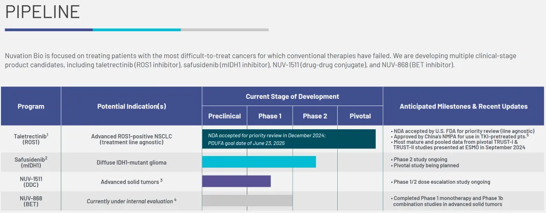 2024年12月底,Nuvation Bio宣布他雷替尼NDA已获FDA受理并予以优先审评,用于治疗ROS1阳性晚期NSCLC患者,该NDA的处方药使用者费用法案(PDUFA)日期为2025年6月23日。