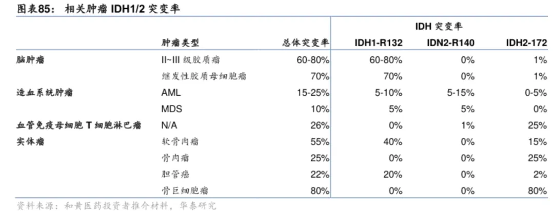 证据显示,目前IDH1突变率高且全球主要开发的肿瘤适应症分别为胶质瘤、IDH突变的急性髓系白血病(AML)和IDH1突变的分化软骨肉瘤。