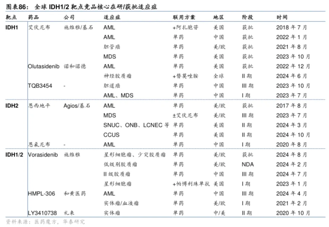 目前全球已获批的IDH1靶向药物有三款,艾伏尼布、Olutasidenib均获批用于治疗IDH1突变AML患者,而施雅维的IDH1/2抑制剂Vorasidenib是FDA批准的首个且唯一一款用于治疗IDH突变2级胶质瘤的靶向药物,于2024年8获批。