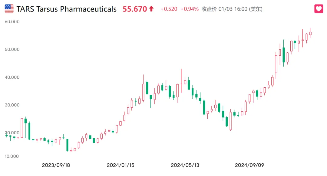 比如在眼科领域, Tarsus Pharmaceuticals治疗蠕形螨性睑缘炎的XDEMVY滴眼液在2023年7月获得FDA批准, 2024年前三个季度的销售额分别为2470万美元、4080万美元、4500万美元,不断超出市场预期,公司股价年内涨幅远超1倍。该药的大中华区权益在2024年3月,被远大医药花费1500万美元引进。