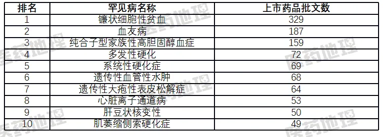 表:《第一批罕见病目录》国内上市药品批文数TOP10疾病