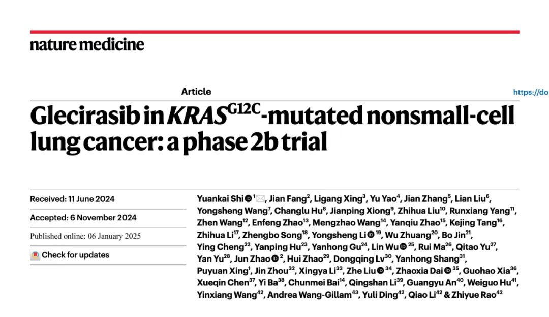 北京、上海、波士顿,2025年1月7日——加科思药业(1167.HK)宣布其自主研发的KRAS G12C抑制剂戈来雷塞注册性临床试验数据在《Nature Medicine》(影响因子58.7)发布。在文章中,加科思首次完整公开戈来雷塞治疗KRAS G12C突变的二线以及上肺癌患者的完整数据。