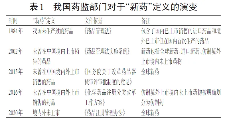 2015年8月,《国务院关于改革药品医疗器械审评审批制度的意见》(国发〔2015〕44号,以下简称“44号文”)颁布,其将新药的定义正式确定为“未曾在中国境内外上市销售的药品”,即“全球新药”,并根据物质基础的原创性和新颖性,将新药分为创新药和改良型新药。至此,自84版《药品管理法》颁布至今,新药的定义经历了由最初“我国未生产过的药品”变为“未曾在中国境内上市销售的药品”,最终确定为“未曾在中国境内外上市销售的药品”的演变,尽管这一定义目前仍有争议,但确实强调了新药要“新”的理念。1984年至今我国药监部门对于“新药”定义的演变见表1。