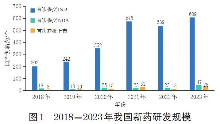 随着各项政策的逐步落实,我国仿制药一致性评价过评品种数量和创新药上市规模持续增长和扩大。根据国家药品监督管理局药品审评中心(Center for Drug Evaluation,CDE)官网数据,2018-2023年,我国仿制药一致性评价工作中的过评药品品种从112个稳步增长至742个。各年度首次提交临床试验申请(investigational new drug,IND)、首次提交新药注册申请(new drug application,NDA)和首次获批上市的国产创新药数量均呈现增长态势(图1)。