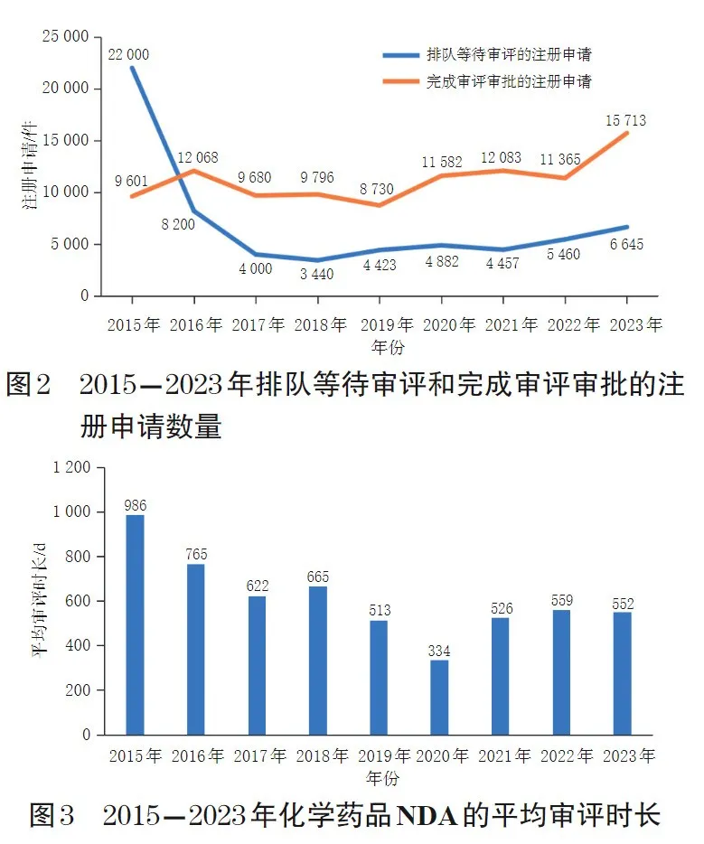 经过对药品审评审批制度的深化改革,制约审评效率、浪费审评资源的因素被逐一攻破,药品审评时间和审评完成情况都有了极大改善。从CDE发布的数据(图2和图3)可以看出,自2015年44号文发布后,在国家药监部门排队等待审评的注册申请数量有了一个断崖式下降;到2023年,完成审评审批的注册申请数量达到了15 713件,化学药品NDA的平均审评时长也由2015年的986 d下降到2023年的552 d。