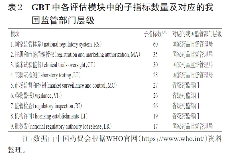 2016年,世界卫生组织(World Health Organization,WHO)出于推进全球监管信赖与依赖目的,正式引入全球基准评估工具(Global Benchmarking Tool,GBT)(现行版为2021年修订的第6版)来对各国药品、疫苗整体监管体系、监管能力进行系统性评估,目前已逐渐成为国际认证新趋势。GBT分为9个模块(表2)、268个子指标,评估范围不仅包括国家药品监管机构,也包括对地方药品监管机构的考察。由于我国疫苗产品不涉及地方监管,因此我国的疫苗监管早在2022年就获得了WHO高成熟度认证(表3)。但在药品监管领域,尽管近年来借助加入PIC/S契机,国家和各级药品监管部门持续完善药品检查制度和管理体系,强化监管能力提升目标,但各省级监管部门之间质量管理体系的建设和实际运营情况差异仍然较大,监管尺度、监管能力不一的问题始终客观存在。例如根据2022年《药品监督管理统计年度数据》统计报告,截至2022年底,上海市和云南省颁发的药品生产许可证数量接近,分别为217、232件,但上海仅市级职业化、专业化检查员队伍就有1 062人,而云南全省仅有162人左右的规模。两地区专业人员数量差异悬殊,颁布的许可证数量却相差无几,这易引起不同省市的医药企业对地域公平性和监管质量的质疑,暴露了属地监管体制的可能弊端。