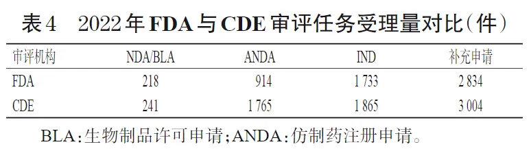 随着医药产业的高速发展,我国CDE药品审评任务受理量已经与FDA逐渐相当(表4),但审评人员数量却与美国相差甚远。对第十五届健康中国论坛和西南证券官网公开资料整理可以发现,2022年,CDE约有650人,其中审评专业技术人员458人;而根据FDA官方报告显示,2022年美国药物评价和研究中心(Center for Drug Evaluation and Research,CDER)共有超5 000人的审评队伍,其中3 000人左右属于科学家和/或专家,我国CDE审评人员数量仅为美国CDER的1/7~1/6。